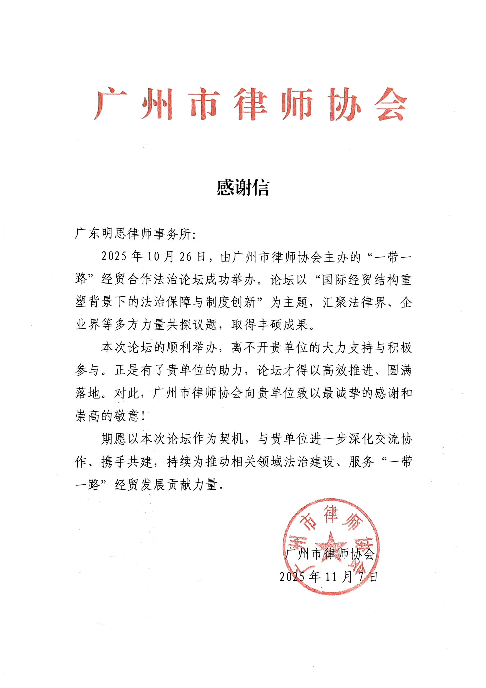 2025年10月26日,由广州市律师协会主办的 “一带一路”经贸合作法治论坛” 成功举办。广东明思律师事务所大力支持、积极参与本次论坛,获广州市律师协会感谢信。
